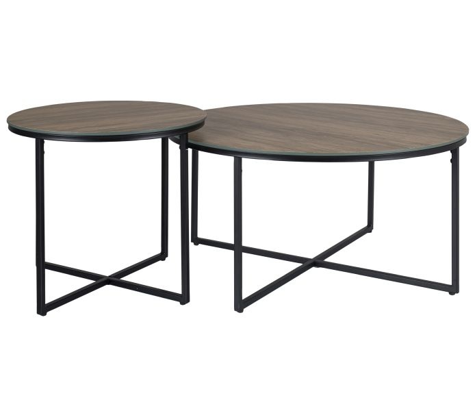 Ett par fina satsbord med vintage design. Borden är tillverkade i svart pulverlackad metall med valnötsmelamin.