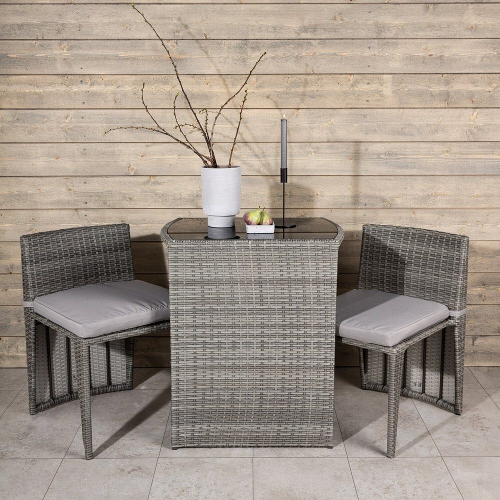 Mysigt grått caféset i en nätt design tillverkat i tåligt konstrotting som passar perfekt till den mindre uteplatsen. Cafésetet består av två stolar och ett bord med tillhörande glasskiva som står pall för både väder och vind, de nätta stolarna kommer med mjuka sittdynor och du kan enkelt skjuta in stolarna under bordet för enkel förvaring och platsbesparing. Skötselråd: Konstrotting är ett plastmaterial som passar alldeles utmärkt för vårt skandinaviska klimat. Materialet är UV-beständigt och tåler väder och vind. Att det är UV-beständigt gör att möblerna inte bleknas, däremot rekommenderar vi alltid att förvara möblerna under ett möbelskydd eller på annat vis torrt och svalt - för att förlänga livslängden.