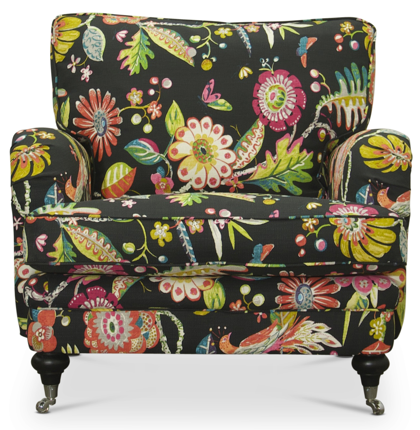 Fåtöljen finns i en rad olika färger på det blommiga tyget Havanna. Tyget är 100% bomull.