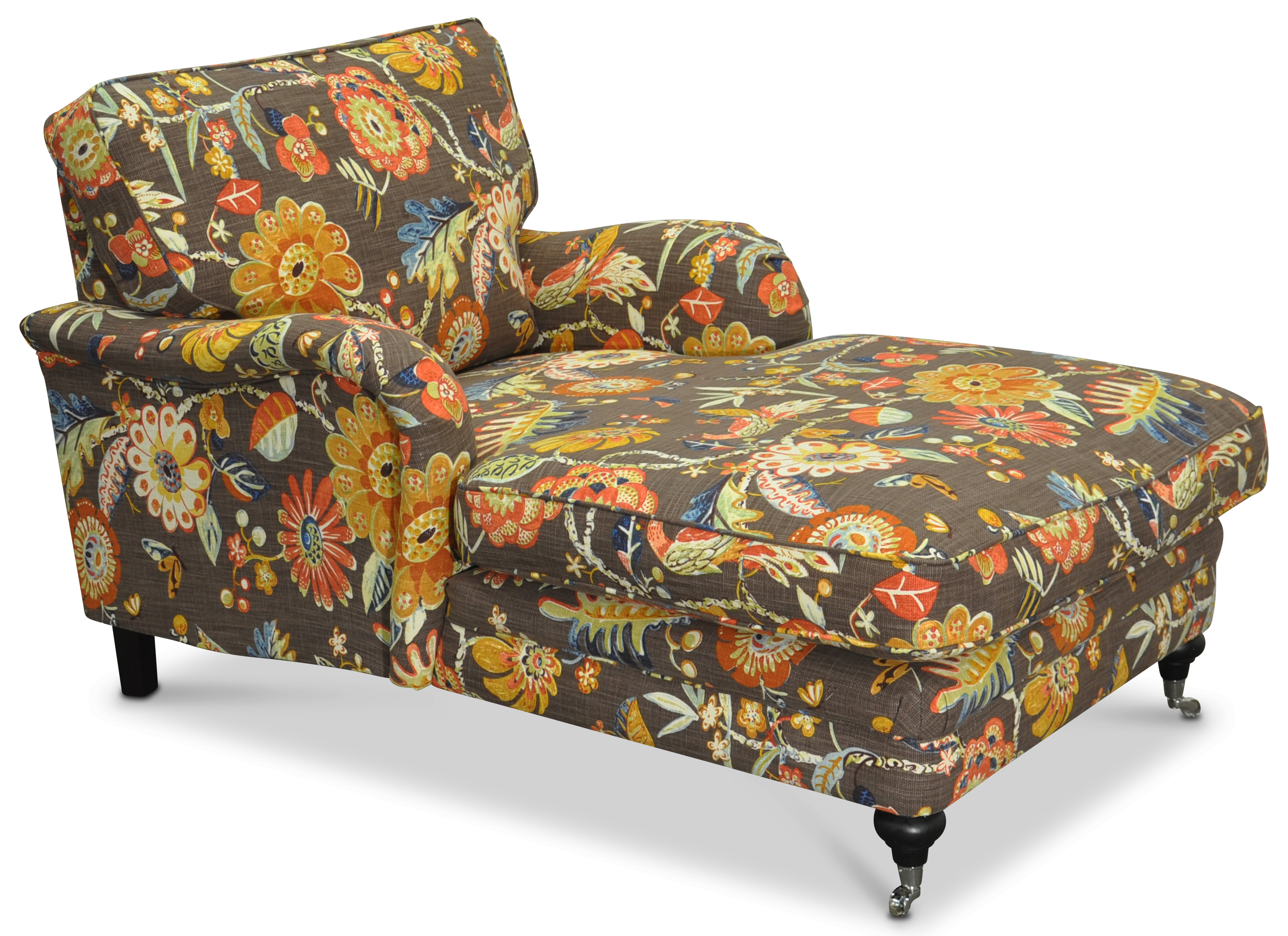 Fåtöljen finns i en rad olika färger på det blommiga tyget Havanna. Tyget är 100% bomull.