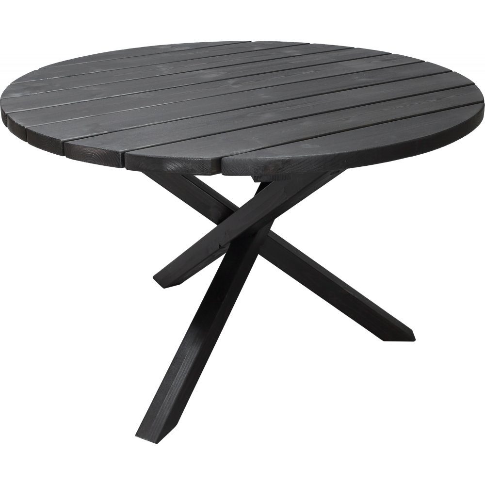 Nätt och prydligt runt matbord i svartlaserad furu till uteplatsen. Bordet har ett underrede med kryssben och bordsskiva i klassiskt utförande.