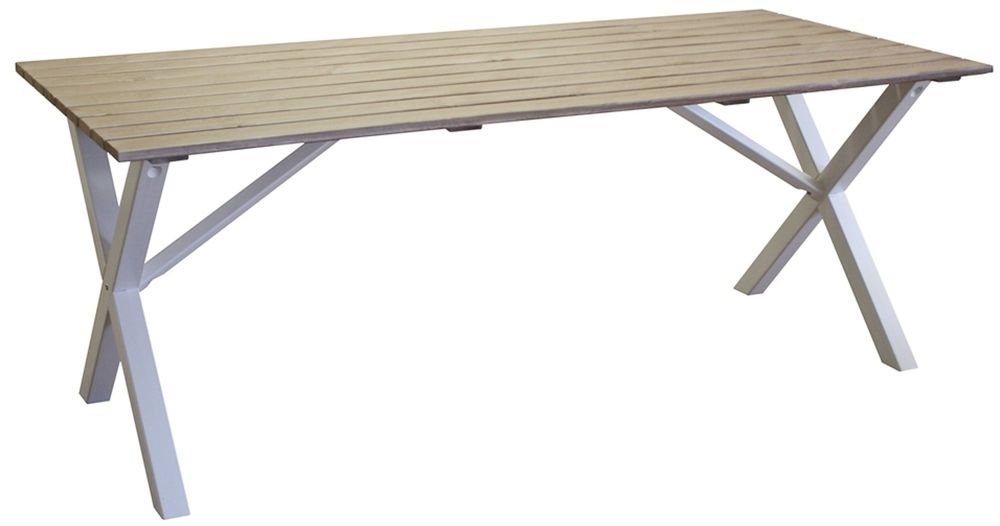 Klassiskt bord i furu med shabby chic utseende från Skånska Möbelhuset. Kryssben som ger ett elegant och klassiskt utseende. Kombinera gärna med några utav våra utestolar för en komplett matgrupp till uteplatsen.
