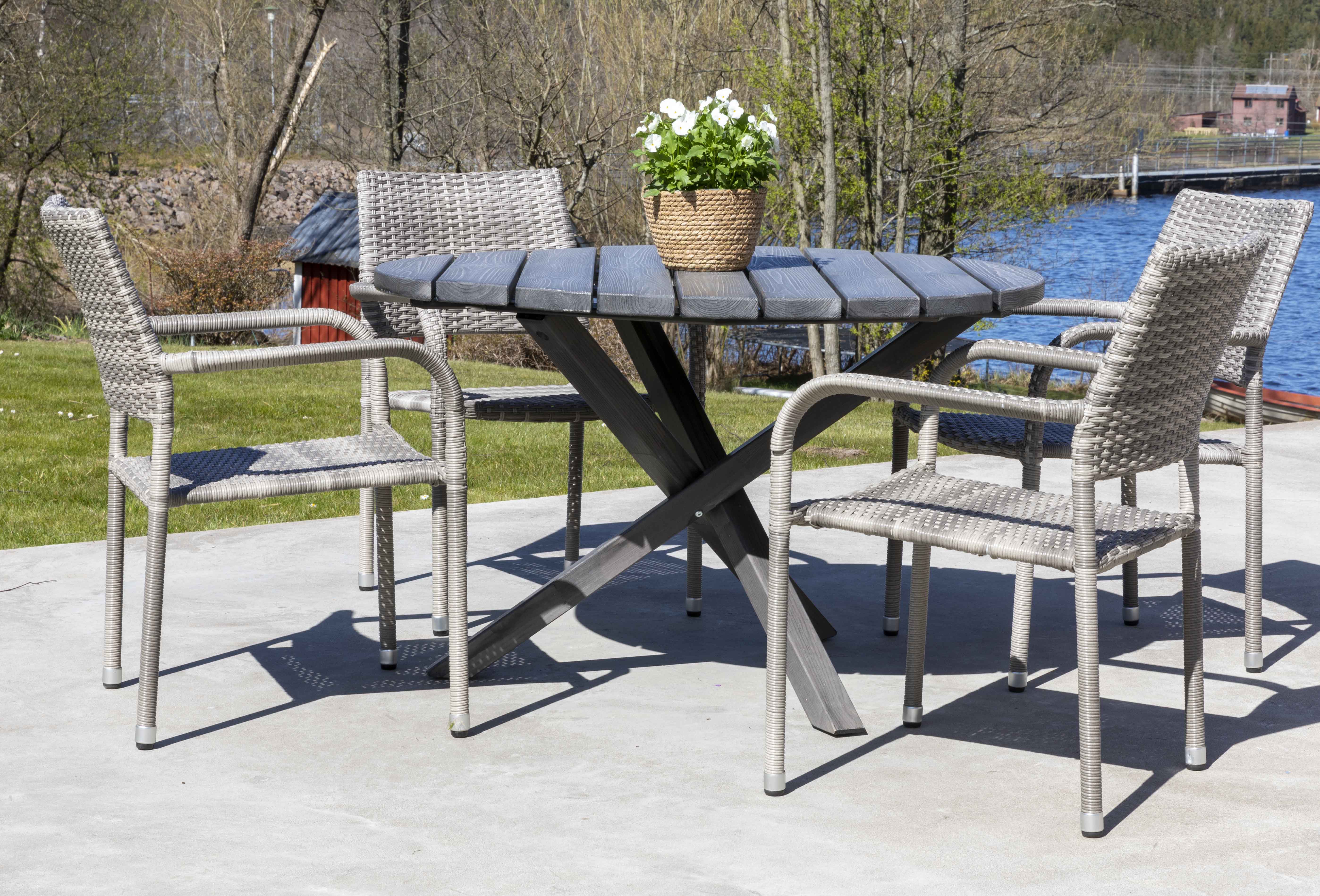 Vancouver matgrupp ger dig en utemöblegrupp i neutral gråmelerad konstrotting som passar in fint i trädgården. Möbelgruppen består av ett runt rejält matbord med 4 stycken matchande stapelbara karmstolar.