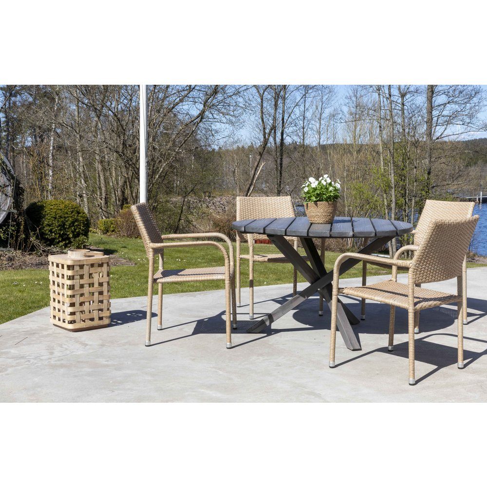 Vancouver matgrupp ger dig en utemöblegrupp i neutral naturfärgad konstrotting som passar in fint i trädgården. Möbelgruppen består av ett runt rejält matbord med 4 stycken matchande stapelbara karmstolar.