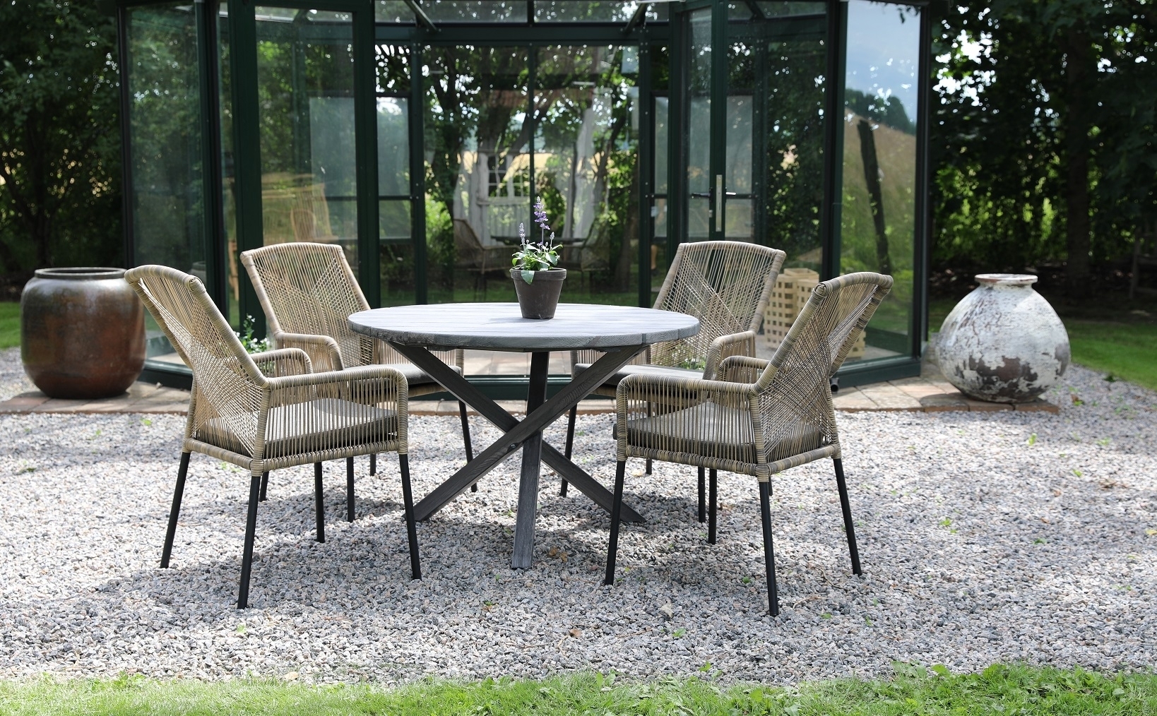 Scottsdale matgrupp för uteplatsen med ett runt rubust matbord, tillsammans med Ystad karmstol med skön sittkomfort. Bordet är tillverkad i grålaserad furu vilket gör utegruppen väderbeständig och tålig för att klara uteplatsens miljö.