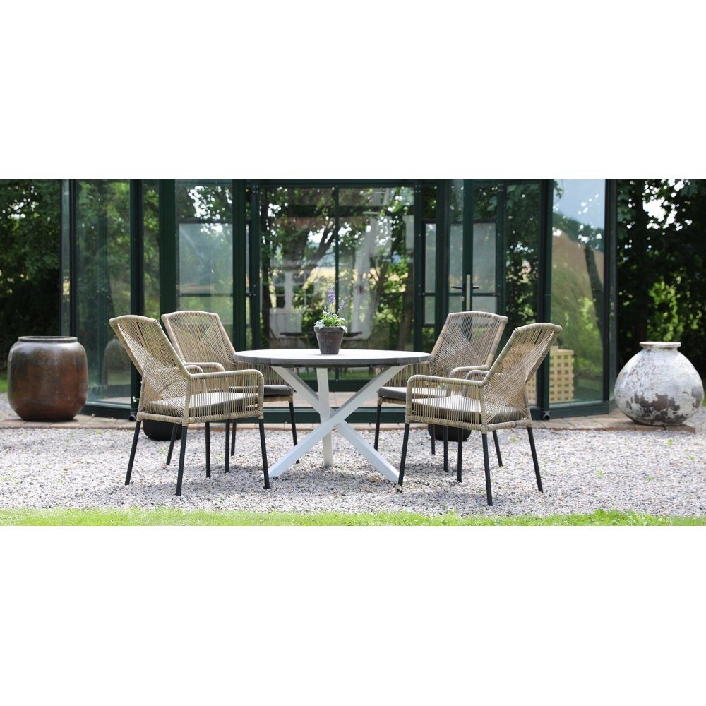 Scottsdale matgrupp för uteplatsen med ett runt rubust matbord, tillsammans med Ystad karmstol med skön komfort. Bordets topp är av grålaserad furu med vitt underrede. Ystad karmstol är i beige tvinnad konstrotting med en grå dyna vilket gör utegruppen väderbeständig och tålig för att klara uteplatsens miljö.