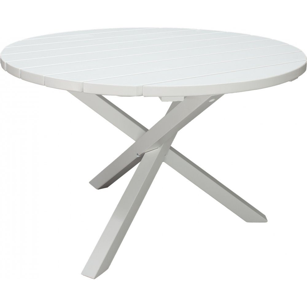 Nätt och prydligt runt matbord i vitmålad furu till uteplatsen. Bordet har ett underrede med kryssben och bordsskiva i klassiskt utförande.