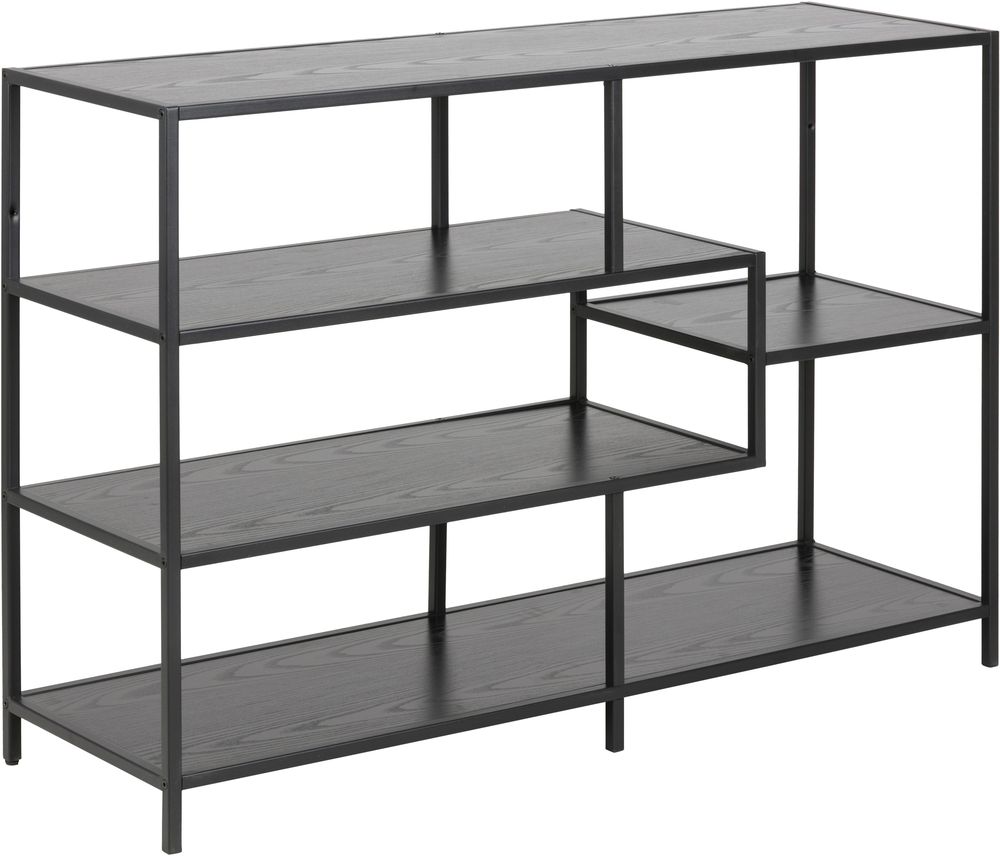 Bokhylla med stomme tillverkad i svart pulverlackerad metall och hyllplan av melamin med ask utförande.