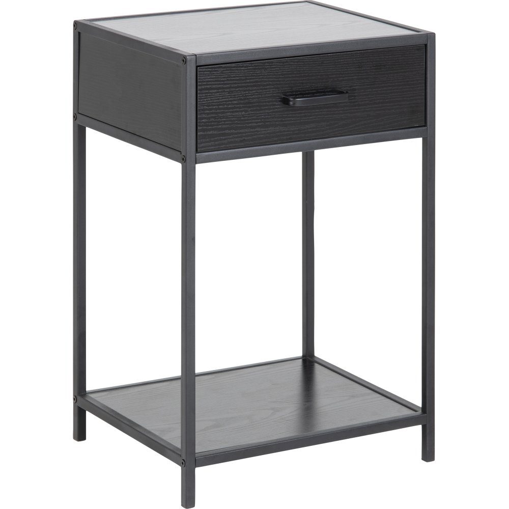Sängbord med ben av pulverlackerad metall. Låda och skivor av melamin och MDF.
