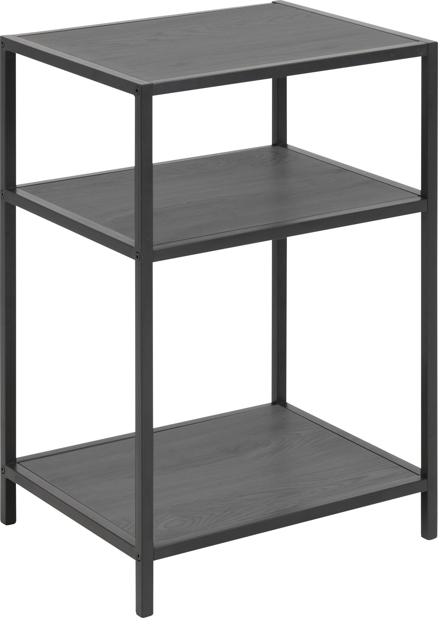 Sängbord med ben av pulverlackerad metall. Bordsskiva av melamin och MDF.