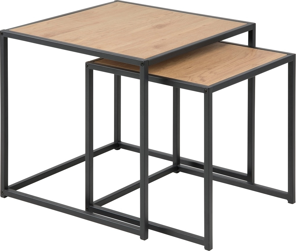 Ett praktisk satsbord bestående av ett lite högre och ett lite lägre bord. Båda i pulverlackad svart metall med toppskivor i folierad ek.
