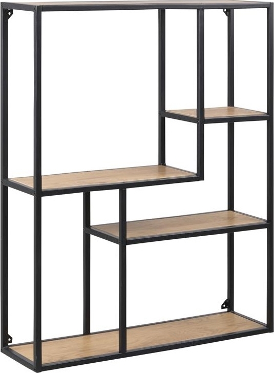 En snygg vägghylla med en modern design. Ramen är tillverkad i pulverlackerad svart metall och hyllplanen är av trä med en härlig vild-ekimitation. Hyllan passar perfekt in på flera olika platser i hushållet och med dess flertal hyllplan i olika storlekar är den perfekt för förvaring av både böcker, prydnadssaker m.m.