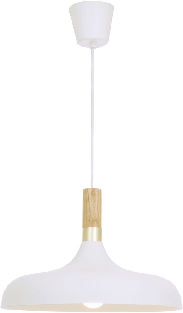 Taklampa i vit metall med detaljer i naturligt trä. Lätt upphängning i tak.
