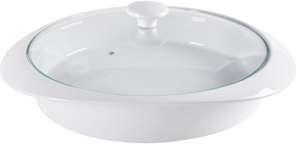 Serveringsfat i vitt proslin med lock av glas. Perfekt för att exempelvis hålla bröden varma till tacos eller varför inte de nygräddade pannkakorna.