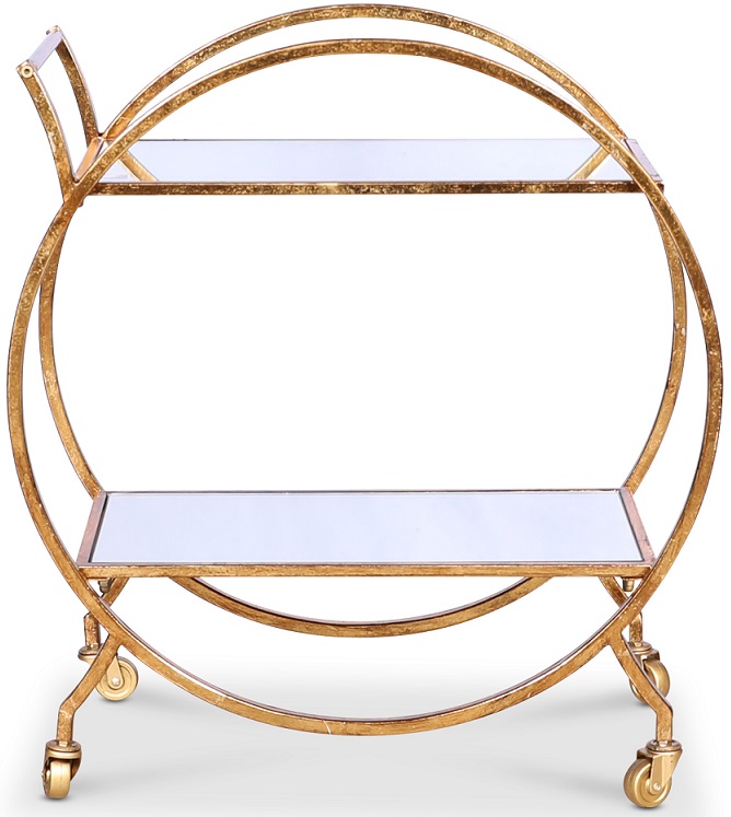 En serveringsvagn med hyllplan i spegelglas. Guldutförande på serveringsvagnen.