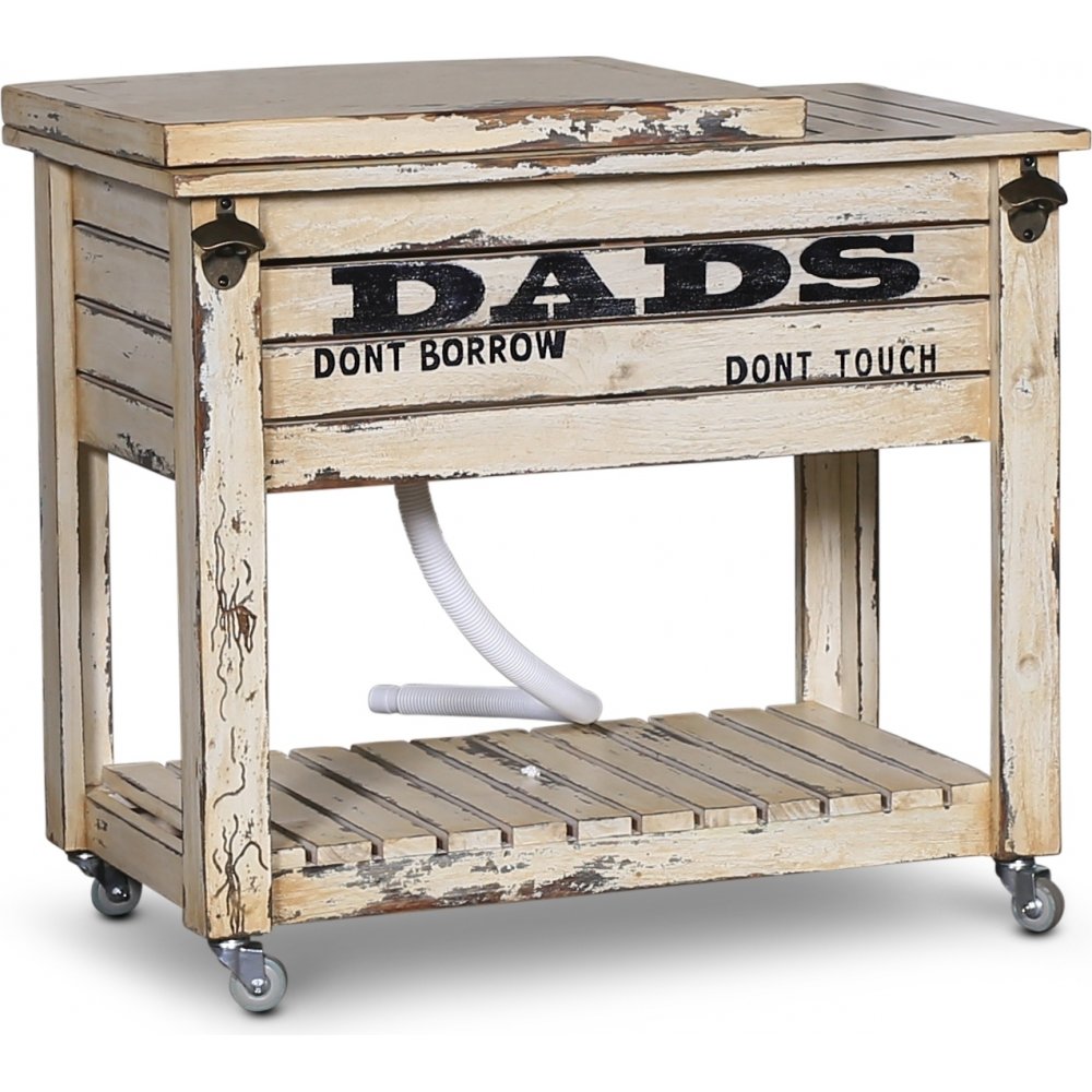 Köksö på hjul med inbyggd kapsylöppnare och en vask med tappningsslang.