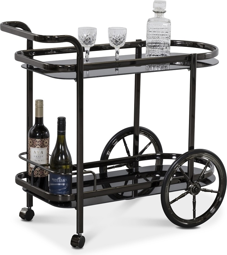 Klassisk serveringsvagn i rökfärgad metal som passar perfekt i både moderna och traditionella hem. Den eleganta rökfärgen på metallen ger vagnen en sofistikerad känsla och gör att den lätt smälter in i olika inredningsstilar. De svarttonade glasen på hyllplanen tillför en touch av lyx och skapar en vacker kontrast mot den metalliska ramen. En stilren och funktionell möbel.