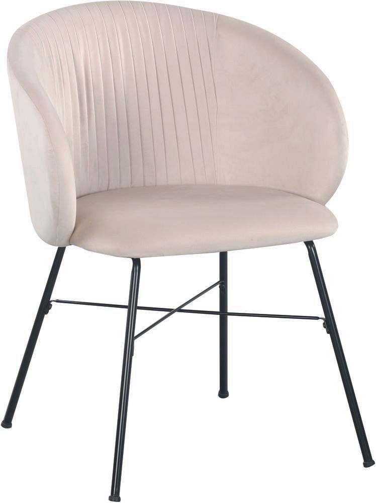 Modern karmstol med sits- och rygg klätt i ett snyggt beige sammetstyg. Ben av svartlackad metall.
