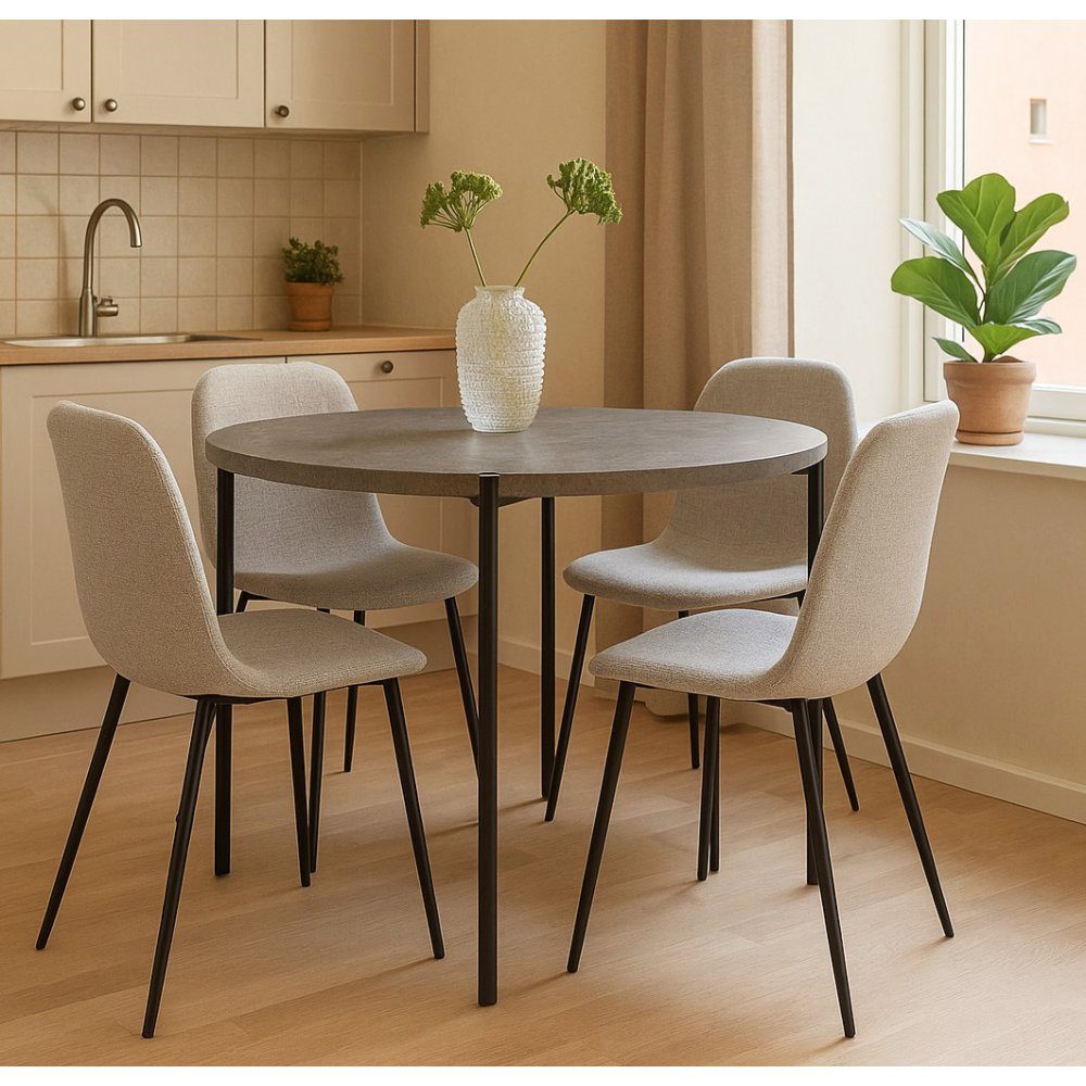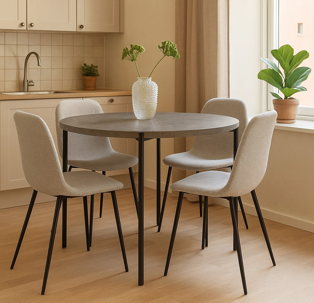Stilren och modern matgrupp med toppskiva av MDF med cementimitation och underrede av svart metall.