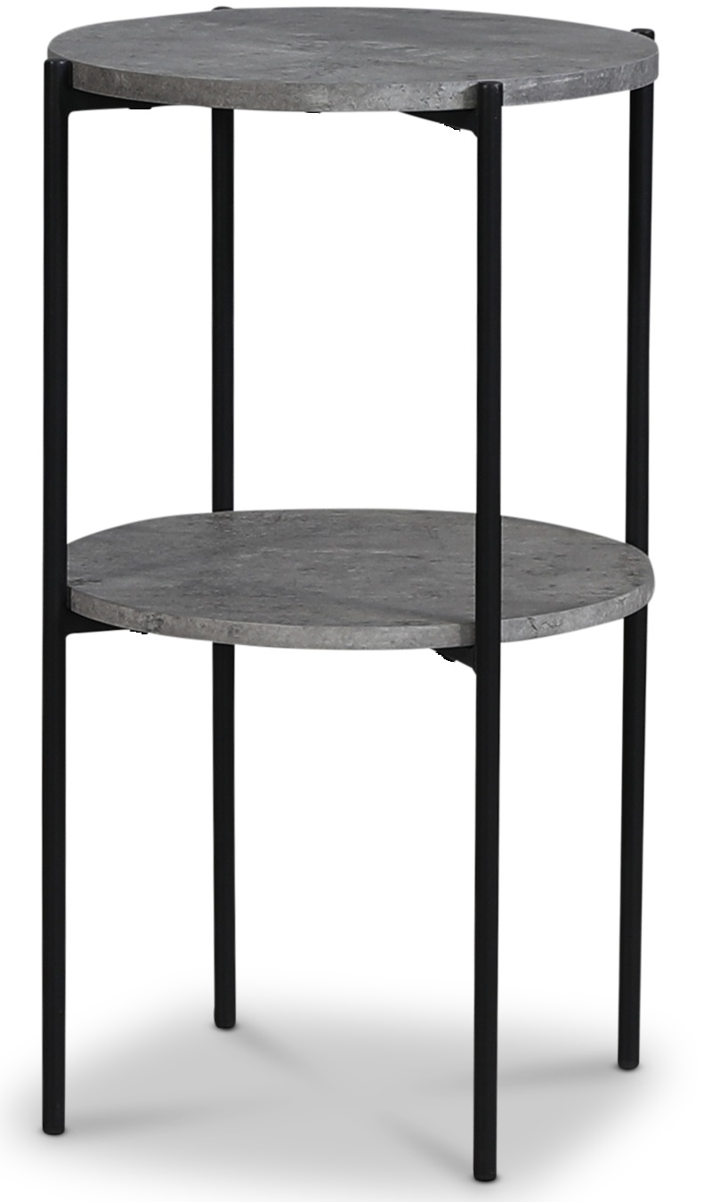 Shanghai sängbord i MDF med cementimitation och svarta metallben. Hyllplan undertill, perfekt att lägga småsaker på.