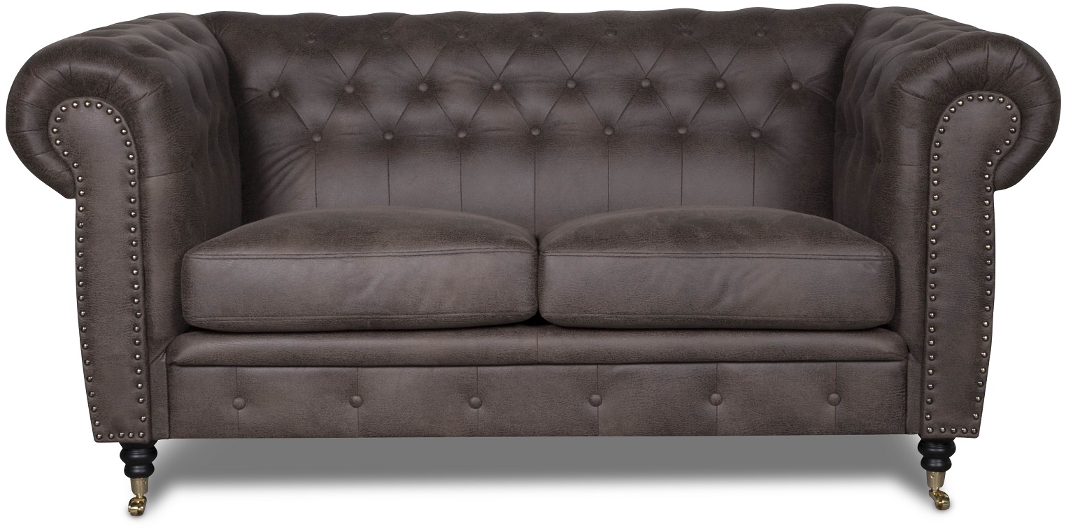 Chesterfield Sheffield 2-sits soffa i ett brunt vintage tyg som liknar skinn, med härlig komfort och god kvalite. Pocketspring fjädersystem med duntopp i sittdynorna för lång hållbarhet och en skön komfort! Benen är i svartlackat massivt trä med mässingsfärgade hjul. Till varje möbel ingår skyddskoppar som kan läggas under hjulen för att undvika märken i ens golv.