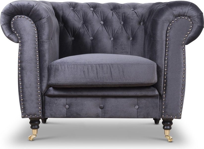 Chesterfield Sheffield fåtölj med härlig komfort och hög kvalite på detaljer och stomme. Pocketspring fjädersystem med duntopp i sittdynorna för lång hållbarhet och en skön komfort. Benen är i massivt trä med hjul som en tidstypisk detalj. Till varje möbel ingår skyddskoppar som kan läggas under hjulen för att undvika märken i golvet.