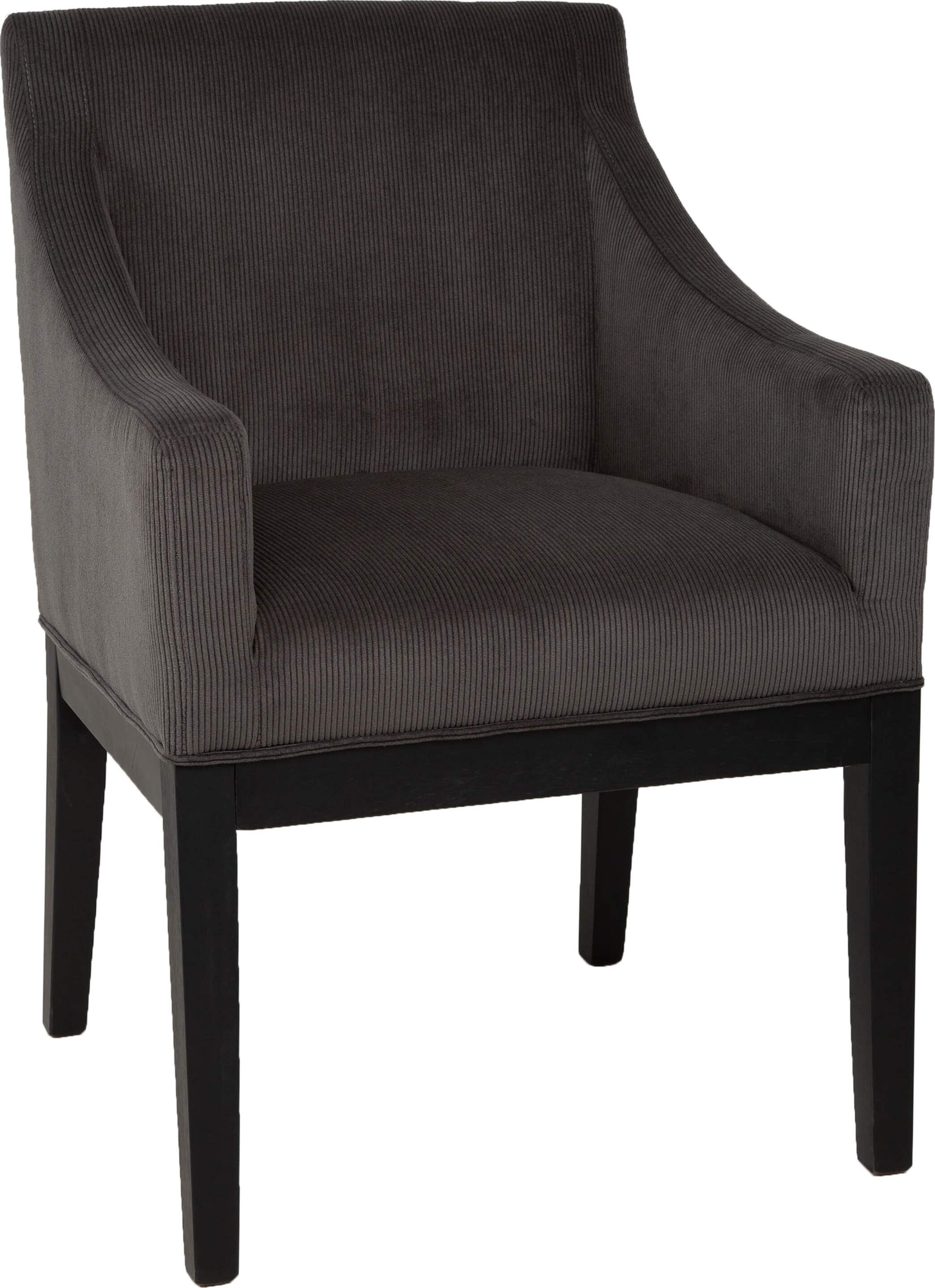 Karmstol av gummiträ. Klädsel av tyg. Stoppning av skum.