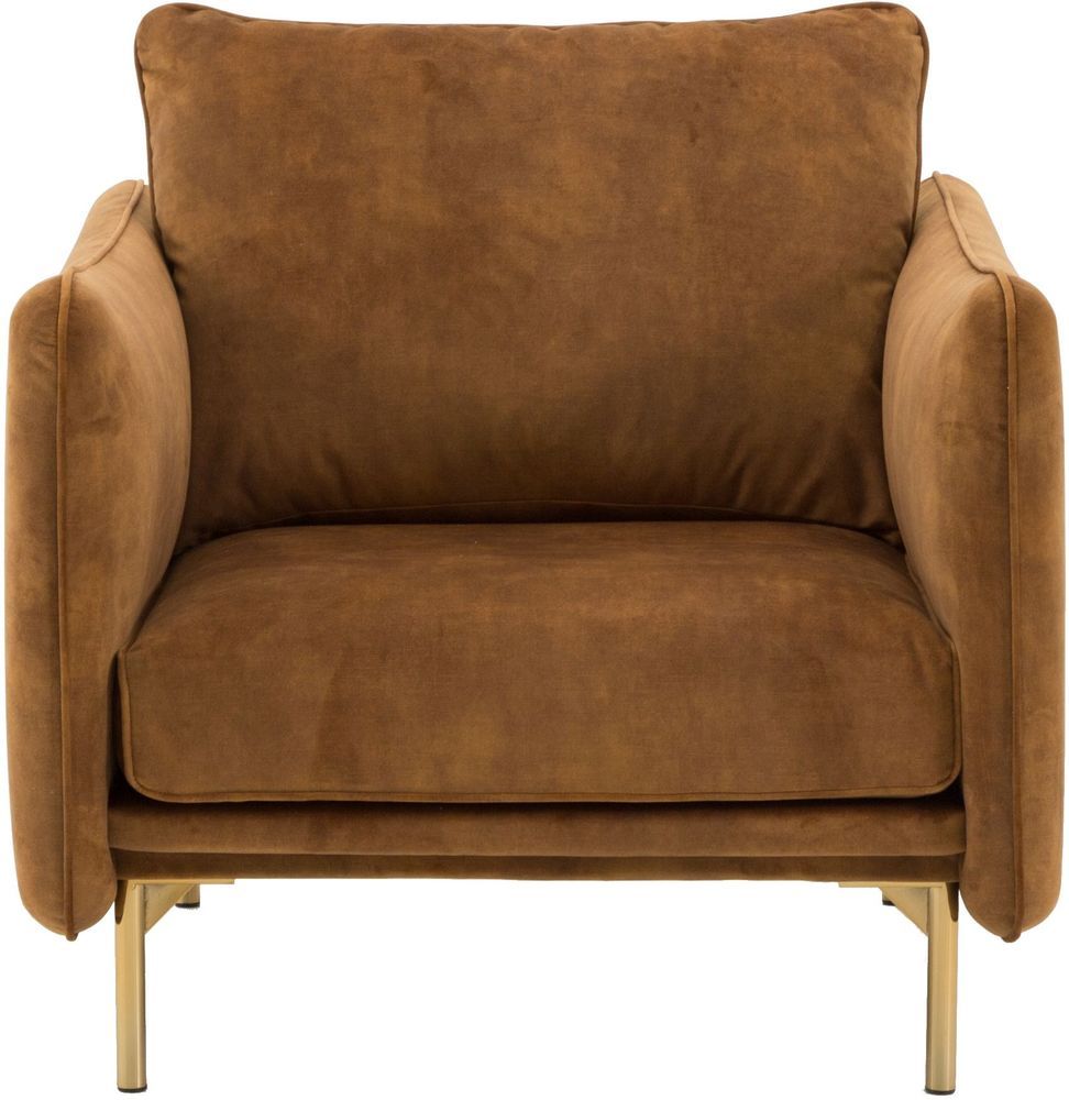 Prydlig och stilren fåtölj i ett mjukt cognacsfärgat tyg. Sittdyna stoppad med dubbla lager kallskum och ryggdyna stoppad med bollfiber och dun.