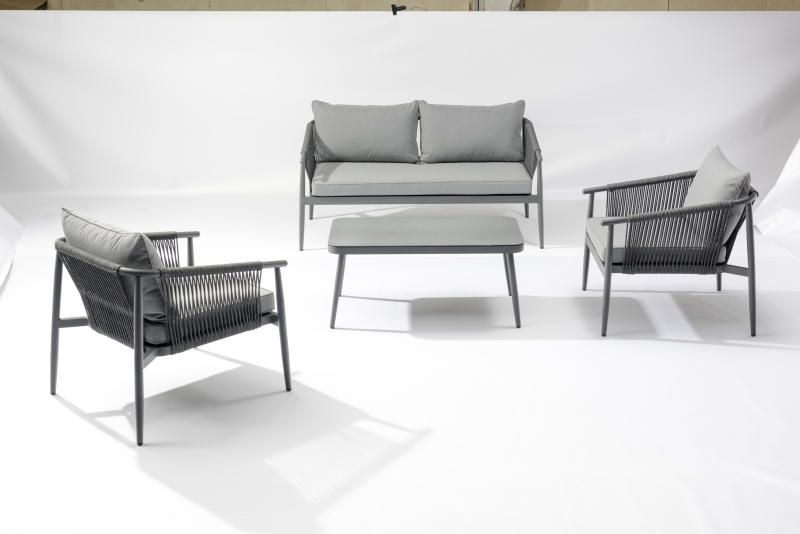 En mysig soffgrupp med en stilren design. Tillverkad i aluminium och konstrotting. En två sits soffa och två fåtöljer gör det möjligt för hela familjen att vara med och njuta av sommaren.