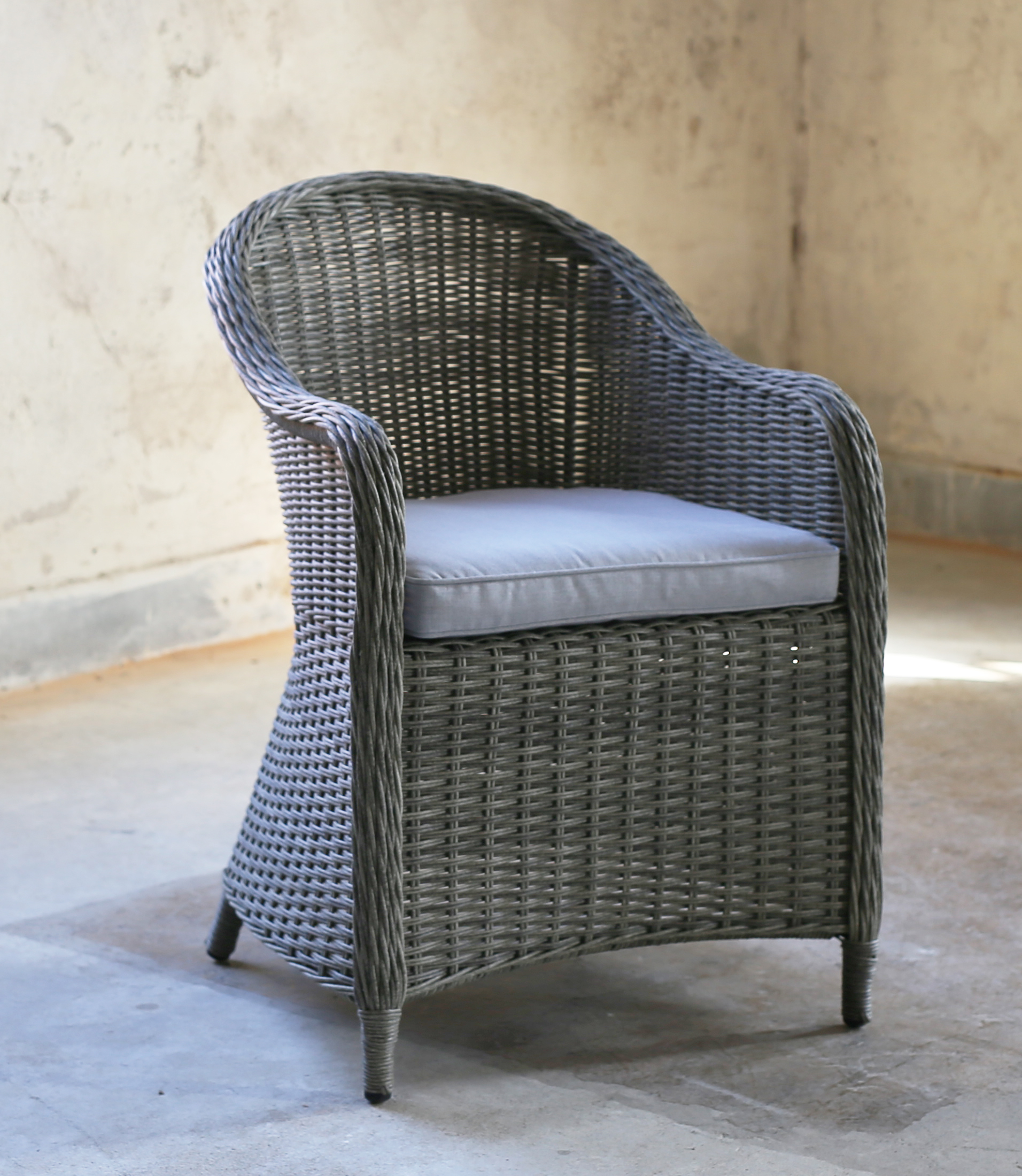 Sienna utestol i grå konstrotting med ljusgrå dyna. En skön och exklusiv fåtölj för uteplatsen.