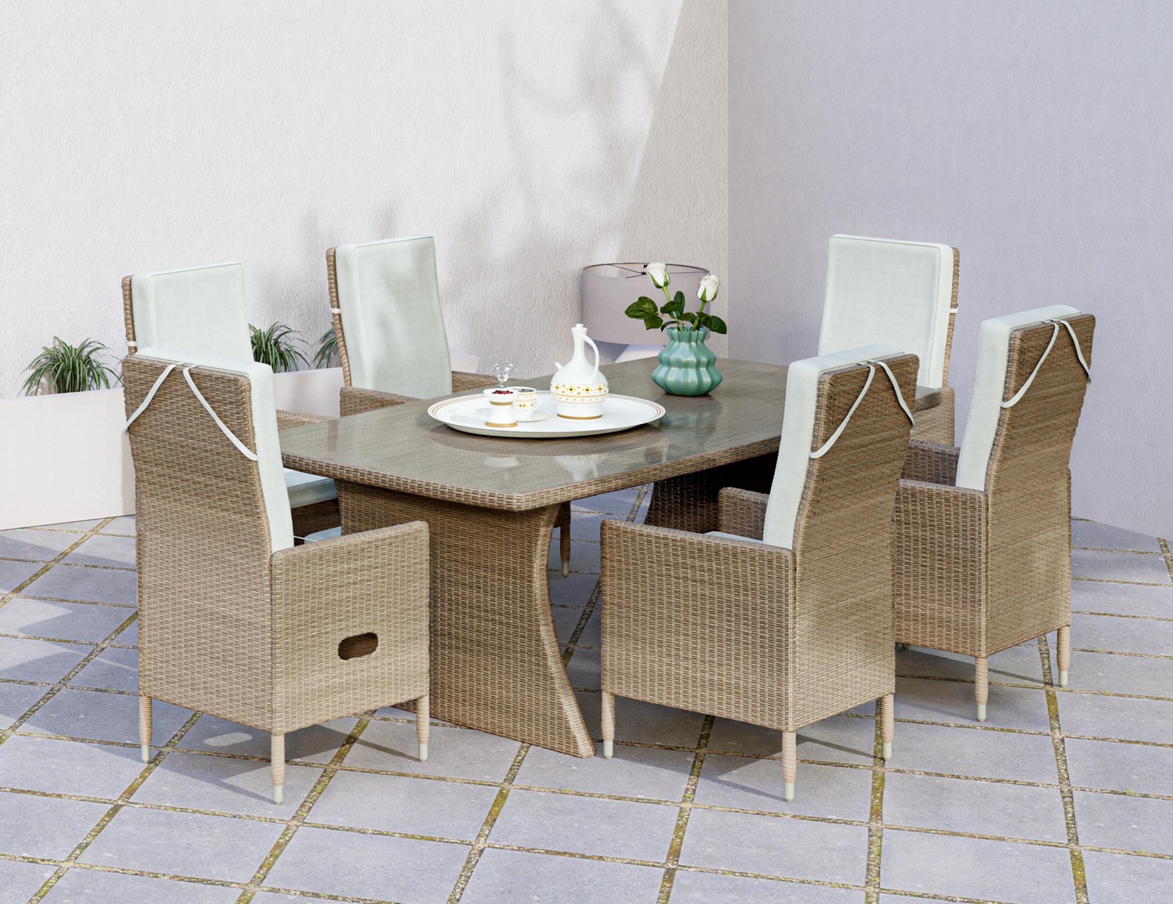 Sienna utemöbelgrupp med ett rejält matbord, sex stycken fällbara stolar, kompletta med rygg/sittdynor i ljusgrått tyg. Bordsskivan är är tillverkat av 5mm härdat glas. Möbelsatsens stommer är tillverkade av metall och sedan klädd i brun konstrotting. Bordets skiva av glas gör det mycket enkelt att städa från smuts och spillor. Stolarna har medföljande dynor som täcker både säte o det höga ryggstödet. Fäll bak ryggstödet till favoritposition och njut.