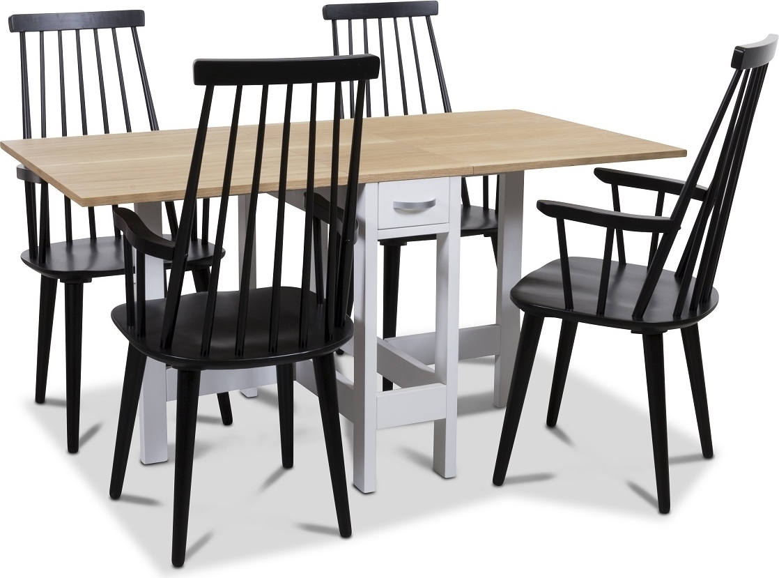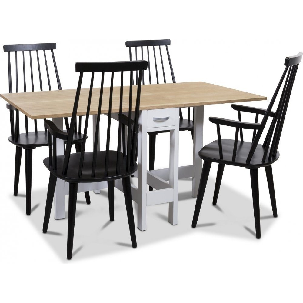 Matgrupp från Skånska Möbelhuset, Klassiskt slagbord Signum med ekfanérad toppskiva och vitlackade ben samt fyra stycken svartlackade Dalsland pinnstolar med armstöd som ger ett klassiskt och stilrent intryck!