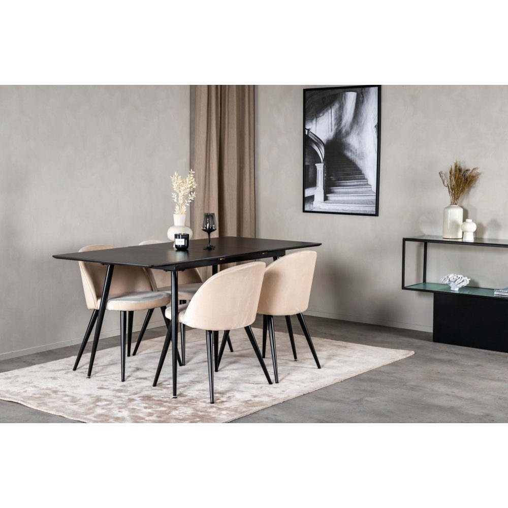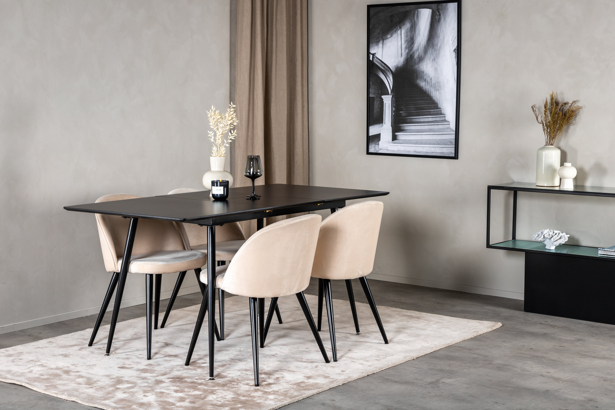 Matgruppen Silar, bestående av ett rektangulärt matbord och matstolar i Velvet-serien, ger ditt hem en modern och elegant känsla. Matbordet i svart, med förlängningsmöjlighet, erbjuder både funktion och stil. De beige matstolarna kompletterar bordet och skapar en inbjudande och sofistikerad matplats som passar både till vardags och för festliga tillfällen.