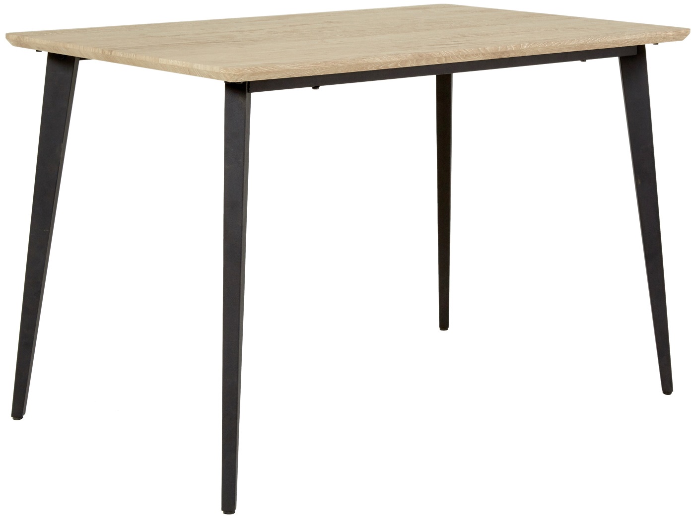 Ett stilrent matbord med en retro design. Bordet är tillverkat helt i MDF med toppskiva i folerat ljust trä. Bordet passar perfekt in i hushållet och är lätt att kombinera med ett par stolar för att skapa en snygg och komplett matgrupp. Benen är i svart pulverlackad metall som matchas till mängder av stilar på matstolar.