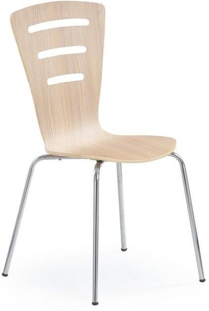 En praktiskt och bekväm matstol som är stapelbar. Tillverkad i plywood med ett härligt ek utförande och underrede i kromad metall.