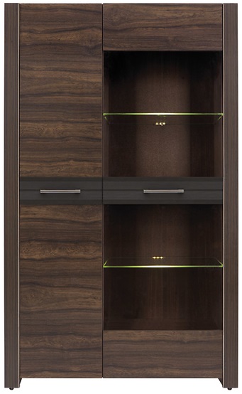 En vacker bokhylla i valnötsimitation med 2 dörrar där den ena dörren är av glas. Inuti bokhyllan finns det LED-belysning vilket ger en fin effekt tillsammans med glasdörren.