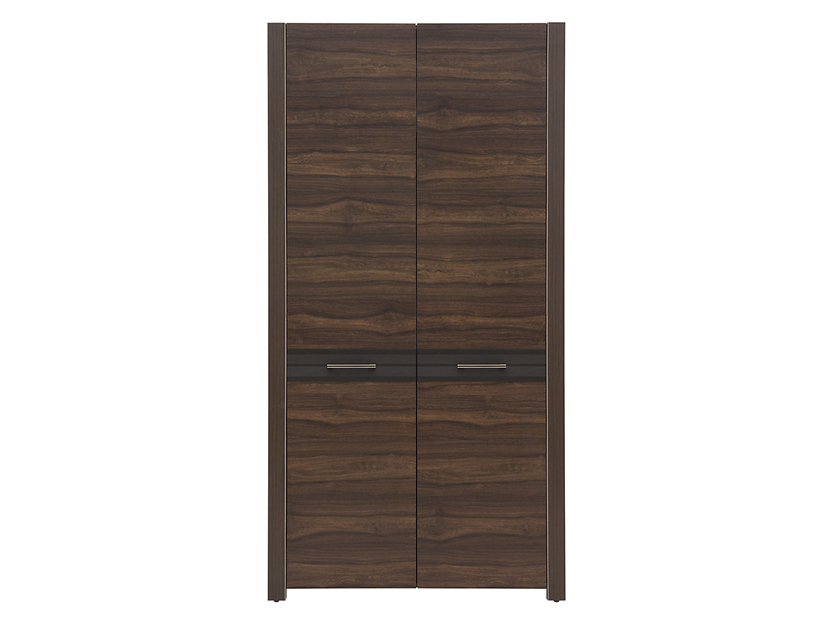 En vacker garderob i valnötfaner med mattsvarta detaljer bakom metallhandtagen. Garderoben är rymlig och inredd med en klädskena och ett hyllplan ovanför.