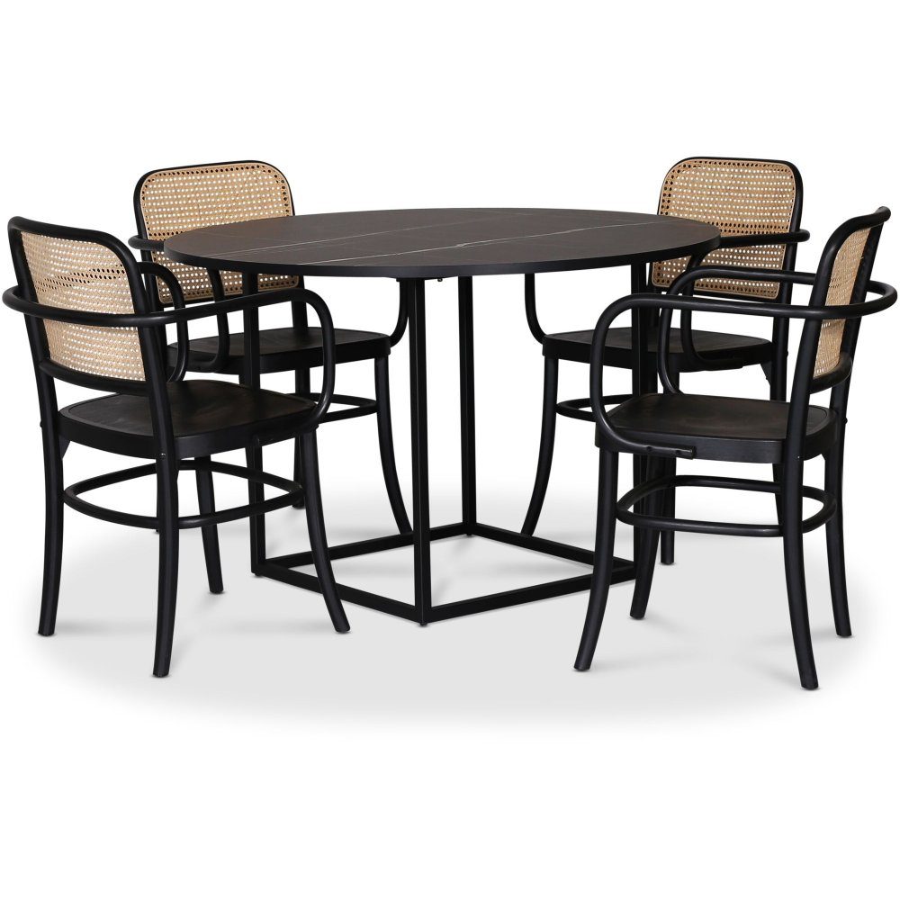 Sintorp matgrupp, runt matbord Ø115 cm inkl 4 st Nemis karmstolar böjträ - Svart marmor (Laminat):