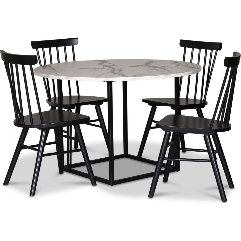 - Sintorp matgrupp, runt matbord Ø115 cm inkl 4 st Orust svarta pinnstolar - Vit marmor (Laminat)