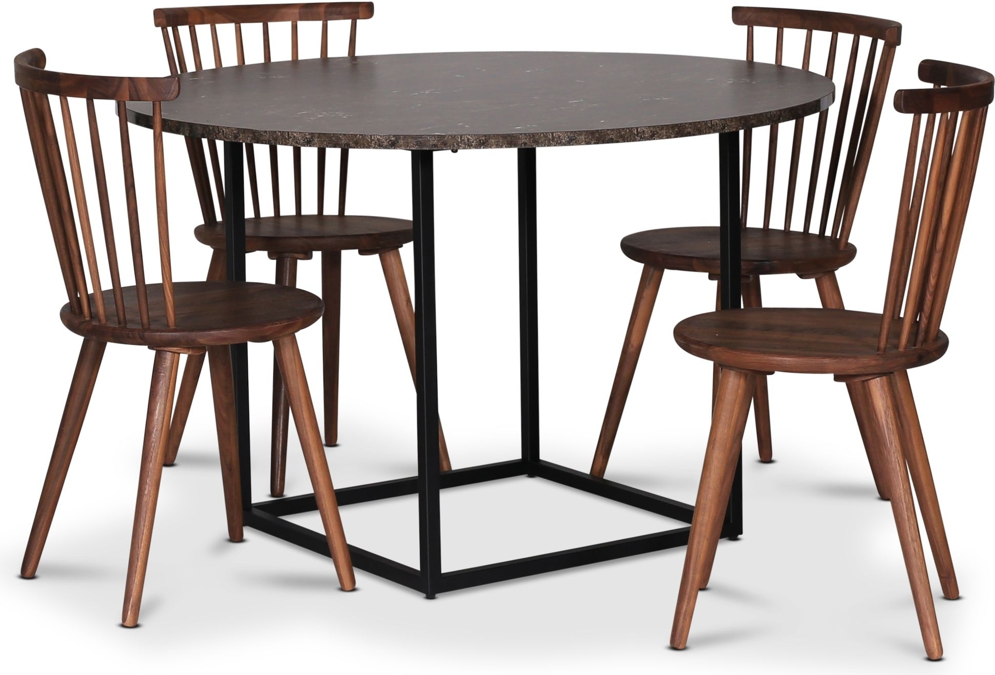 Sintorp matgrupp, runt matbord Ø115 cm inkl 4 st valnöt pinnstolar Castor - Brun marmor (Laminat):