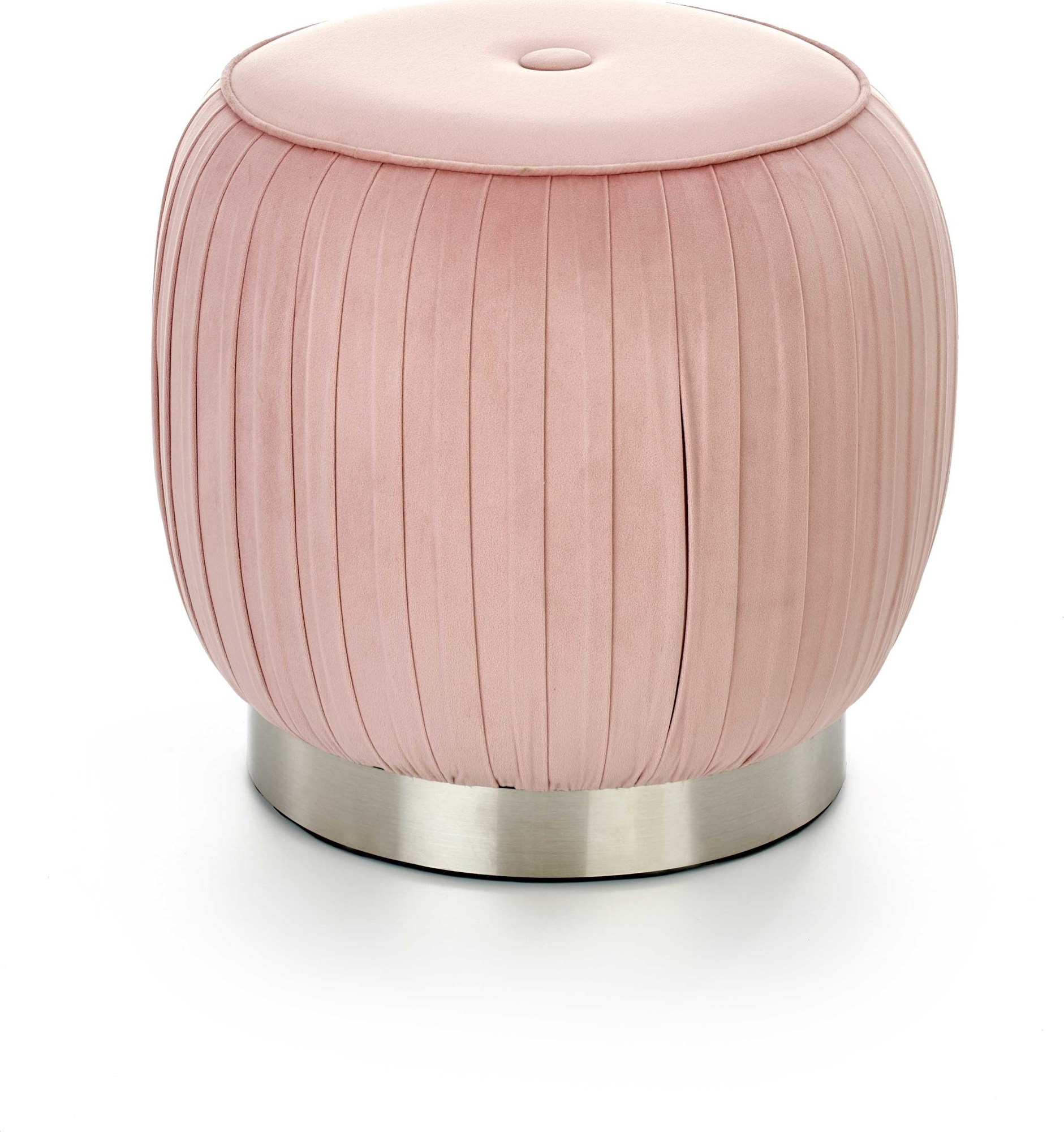 Den här vackra pallen kombinerar stil och funktion på ett sätt som gör den till ett perfekt inslag i ditt hem. Den klädsamma rosa sammeten ger en mjuk och inbjudande känsla, medan det veckade tyget runt sidorna skapar en intressant textur och ett elegant uttryck. Den runda formen och knappliknande detaljen på toppen förstärker dess exklusiva utseende. Basen i rostfritt stål ger en modern touch och säker stabilitet.