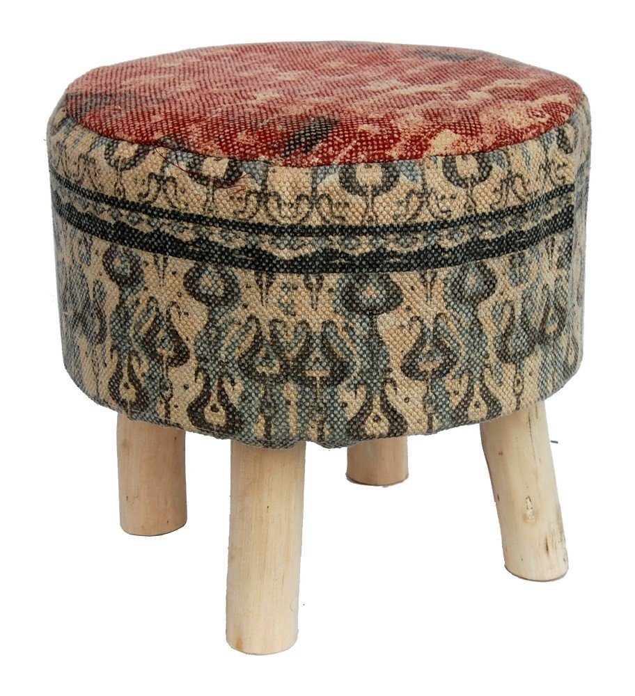 Sittpuff mönstrat i rött / blått tyg med grova ljusa träben. Puffen är stoppad med bomull och har ett vintage utseende, skapar en mysig stämning. Varje sittpuff är unik i finish.