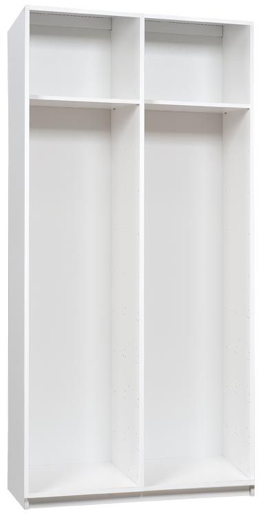 Siv garderob med modern design, flera storlekar och inredningsalternativ. Mycket stabil helvit stomme och dörrar i färgerna helvitt eller silvergrå. Hatthylla medföljer men du väljer själv övrig inredning. Det finns 3 olika inredningar att välja mellan till garderobens smalsida (vänster), samt 2 alternativ för garderobens bredsida (höger).