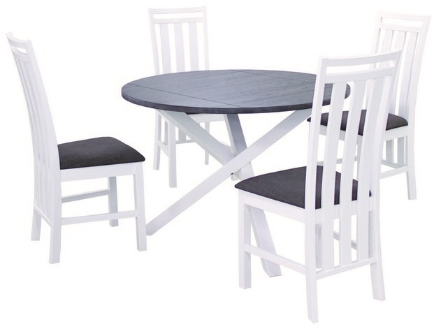 Matgrupp innehållande ett runt bord i massivt hevea trä med underrede i vitt och bordsskiva i mörk ekfaner. Medföljer gör också fyra stycken vita stolar med sits i grått tyg. Kännetecknande för stolar är är dem extra långa stolsryggarna som sätter prägel på stolarna och gör att dem sticker ut.