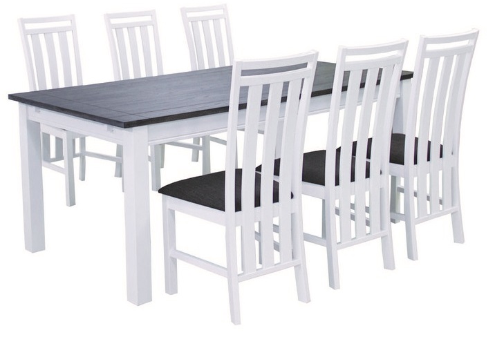 Matgrupp innehållande bord i massivt hevea trä med underrede i vitt och bordsskiva i mörk ekfaner. Medföljer gör också sex stycken vita stolar med sits i grått tyg. Kännetecknande för stolar är är dem extra långa stolsryggarna som sätter prägel på stolarna och gör att dem sticker ut.