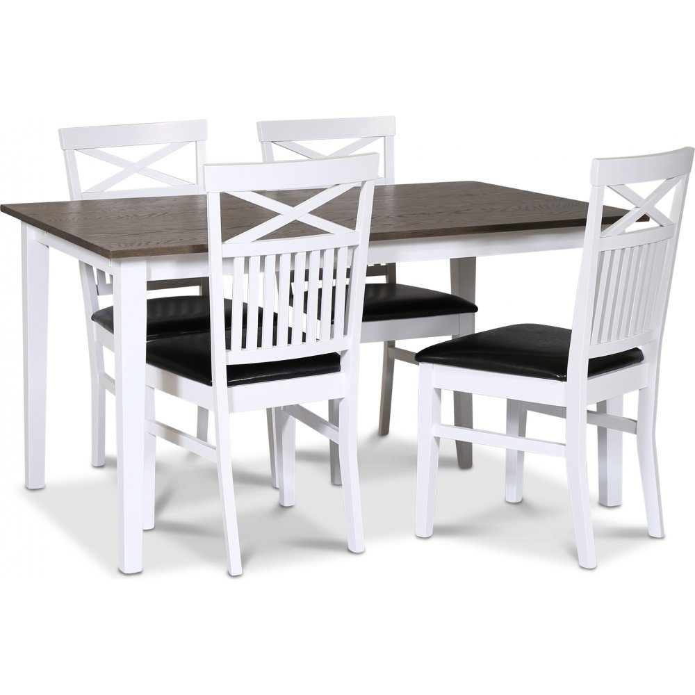 Skagen matgrupp; klassiskt matbord 140x90 cm - Vit / brunoljad ek med 4 st Fårö stolar (Kryss i ryggen) med svart PU-sits