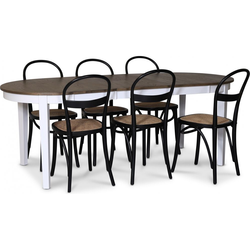 Skagen matgrupp; matbord 160/210x90 cm - Vit / brunoljad ek med 6 st Danderyd No.16 stolar Svarta