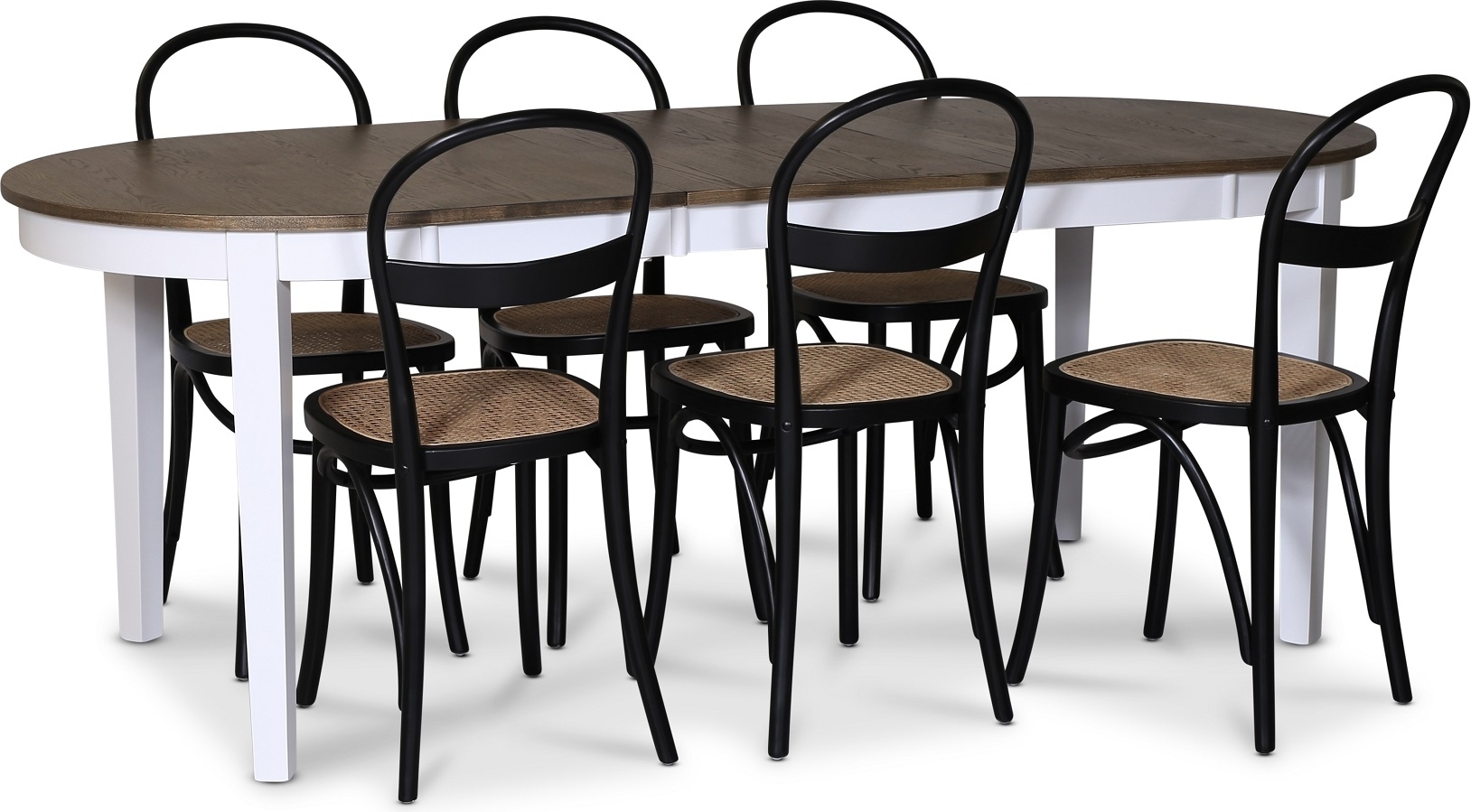 Skagen matgrupp från Skånska Möbelhuset, klassiskt matbord 160/210x90 cm med vitt underrede och en toppskiva i brunoljad ekfanèr. Det ingår 6 stycken matchande Danderyd No.16 matstolar i svartlackat trä med rotting sits.
