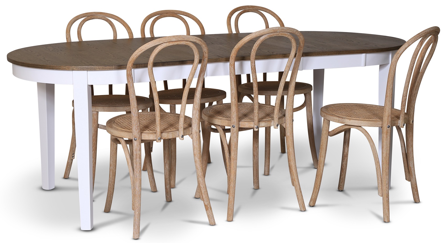 Skagen matgrupp från Skånska Möbelhuset, klassiskt matbord 160/210x90 cm med vitt underrede och en toppskiva i brunoljad ekfanèr. Det ingår 6 stycken matchande Danderyd No.18 matstolar i Borstat whitewash trä med rotting sits.