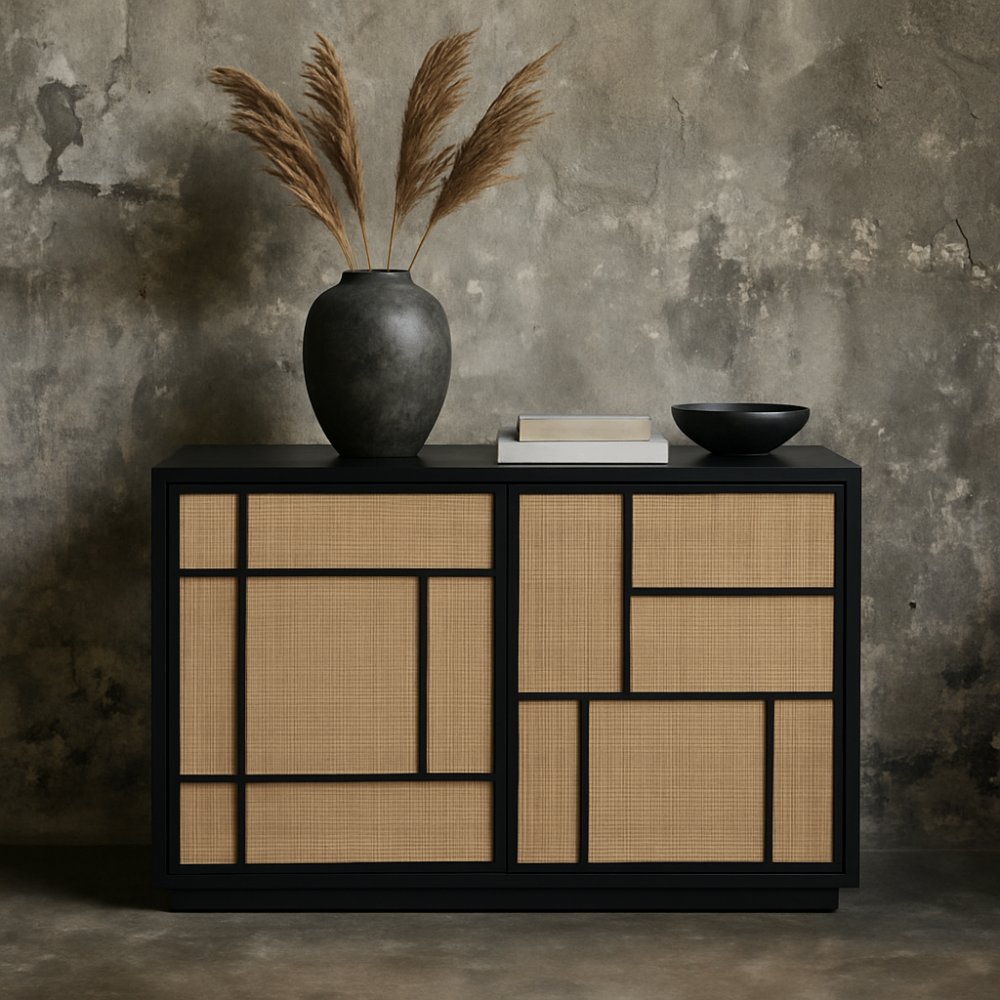 Stockholm sideboard i svartlackat trä med fronter i rotting. Sideboardet har två hyllor. Detta sideboard har bra förvaringsmöjligheter och en trendig design.